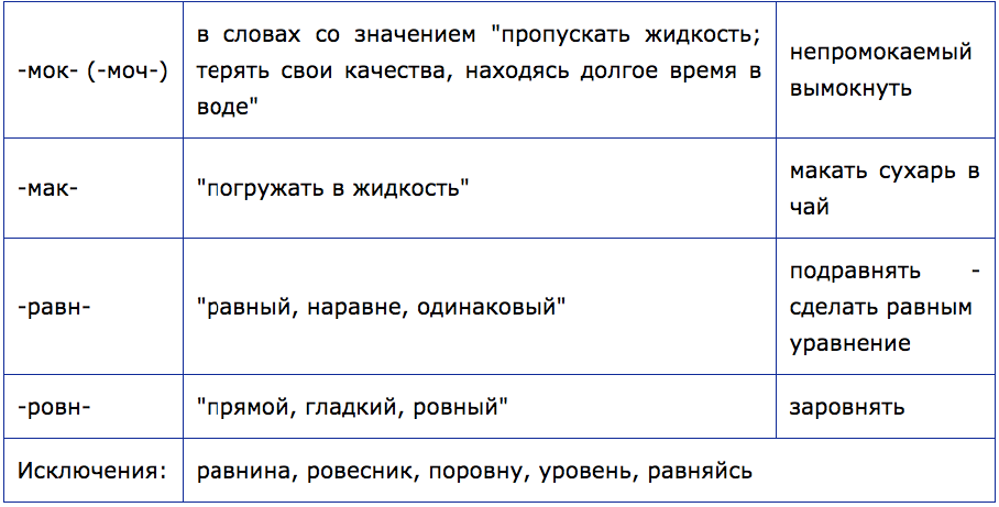 О — А в безударных корнях -мок- (-моч-) — -мак-, -равн- — -ровн-